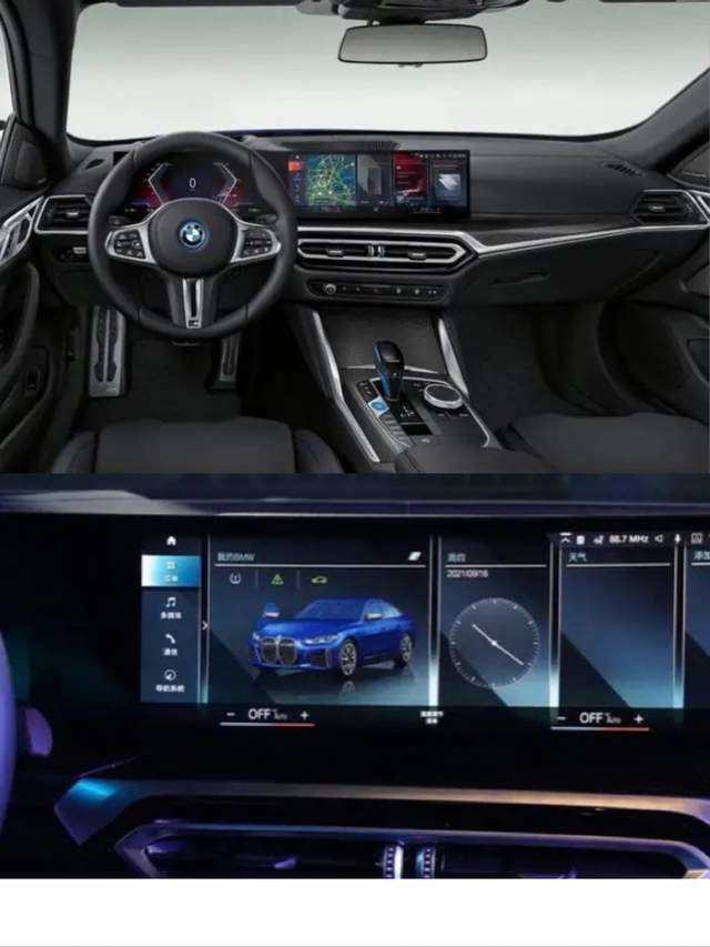 内饰在4系基础上,采用了时下流行的双联屏,且车标和档把处涂装了蓝色装饰,其中仪表盘为12.3英寸和14.9英寸中控屏。该车搭载了宝马最新的iDrive8.0车机系统,内置BMW智能个人助理、充电站地图规划、5G互联、在线地图等多项功能。此外,该车还装备了座椅通风加热、氛围灯、哈曼卡顿音响系统等舒适性配置,且拥有主动刹车、主动巡航控制等40中驾驶辅助功能。