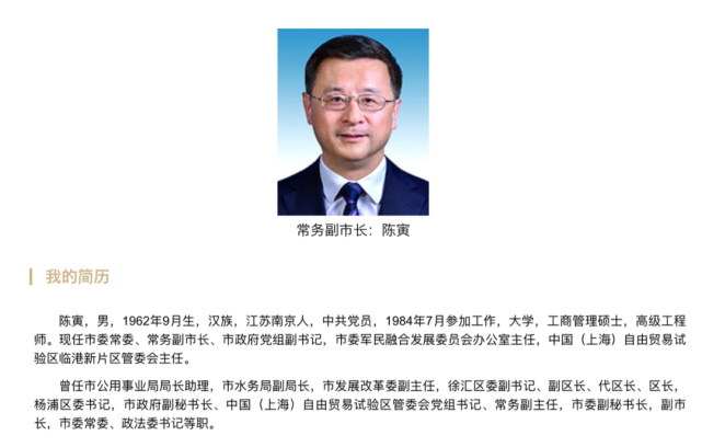 据上海市政府官网介绍,陈寅现任市委常委、常务副市长、市政府党组副书记,市委军民融合发展委员会办公室主任,中国(上海)自由贸易试验区临港新片区管委会主任。