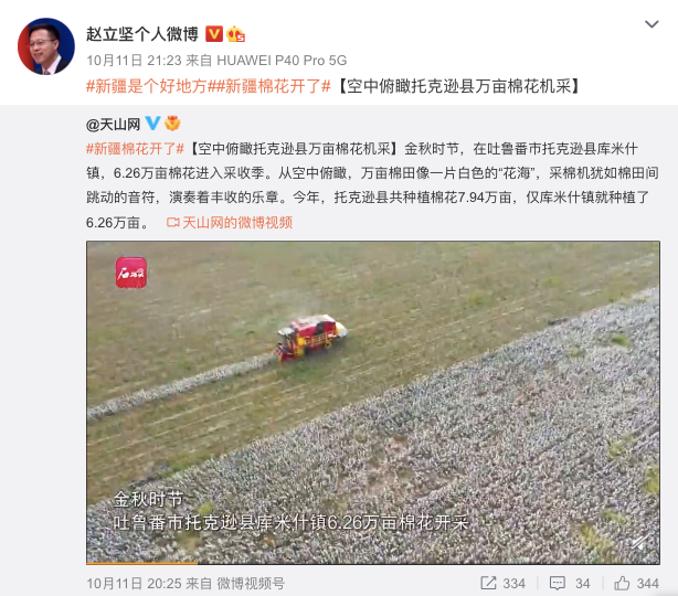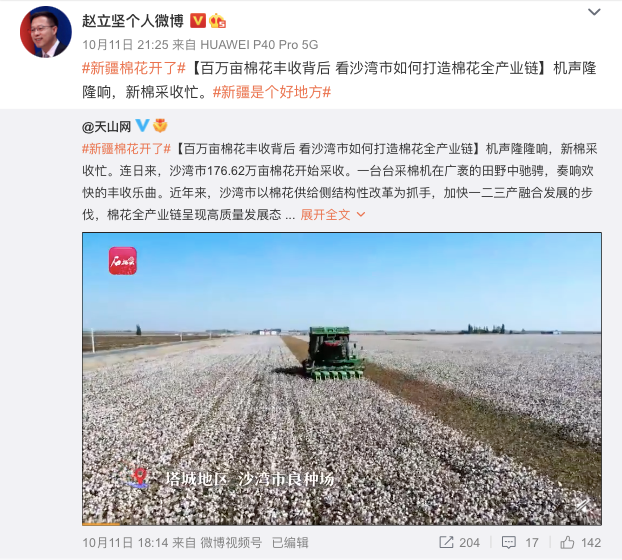 近期新疆棉花采收进入尾期,赵立坚接连转发不少大型采棉机在棉田采收棉花的图文报道。
