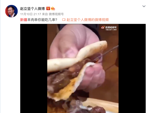 就在11月10日晚上9点多,赵立坚发布了一条美食视频,还提问网友“新疆羊肉串你能吃几串?”虽然视频只有7秒,但“深夜放毒”依然“馋哭了”不少网友。