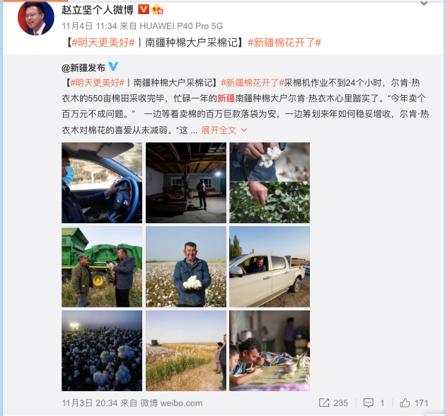 10月29日,赵立坚转发了发布会实录,并评论说“新疆的棉花是白的,但一些人的心却是黑的,美炮制所谓‘强迫劳动’谎言遭到新疆各族人民唾弃。”