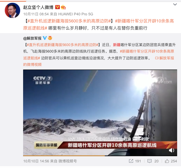 他给网友科普过新疆到底有多大,转发过网友的视频,讲解新疆为什么不包邮,还转发过《解放军报》有关新疆喀什军分区开辟10余条高原巡逻航线的视频,并评论说:“哪里有什么岁月静好,只不过是有人在替你负重前行。”