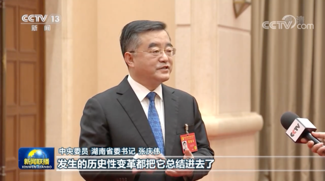 中央委员、湖南省委书记张庆伟说,决议把党的十八大以来党带领全国各族人民取得的历史性成就、发生的历史性变革都总结进去了,这其中有原创性的思想、变革性的实践和标志性的成果。