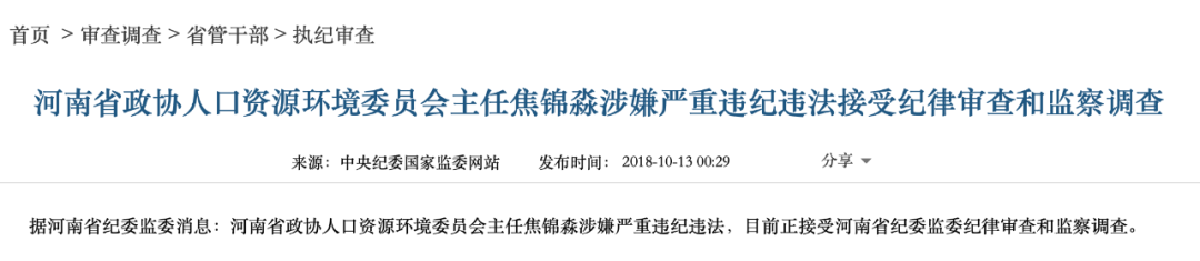 卸任商务厅厅长之后,焦锦淼成为河南省政协人口资源环境委员会主任。2018年10月12日,焦锦淼被查。