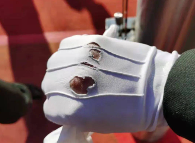 仪仗队战士曾向媒体介绍,由于严苛的训练,他们每人每年要平均穿破七双靴子,所有人的脚上都有磨破的伤痕。仪仗队员三年间走正步的累积距离相当于一个或几个两万五千里长征的里程,每年出的汗将近一吨。