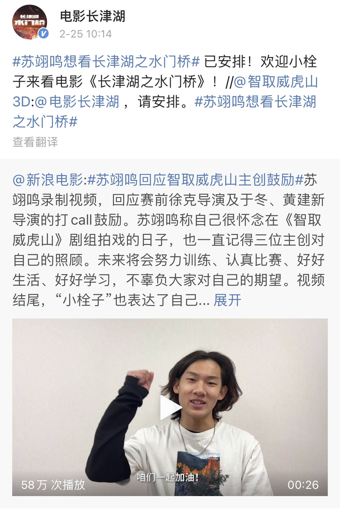 “徐克导演,于冬叔叔,黄建新导演,我是你们的小栓子,你们的鼓励我都收到了……”2月25日,苏翊鸣为电影《智取威虎山》剧组录制的视频曝光,引发不少网友转发、点赞。#苏翊鸣想看长津湖之水门桥#还冲上了热搜。