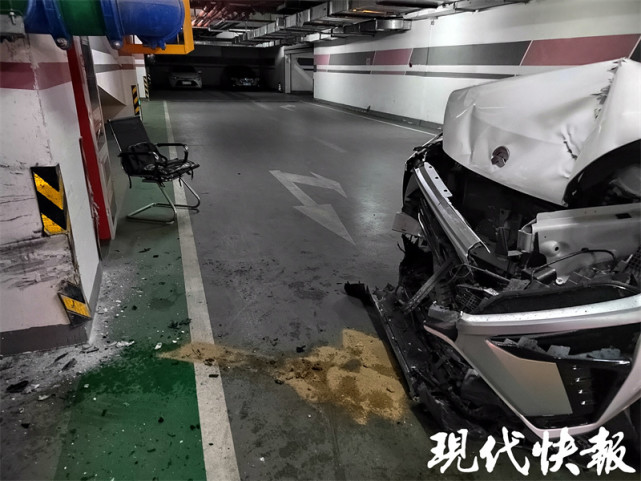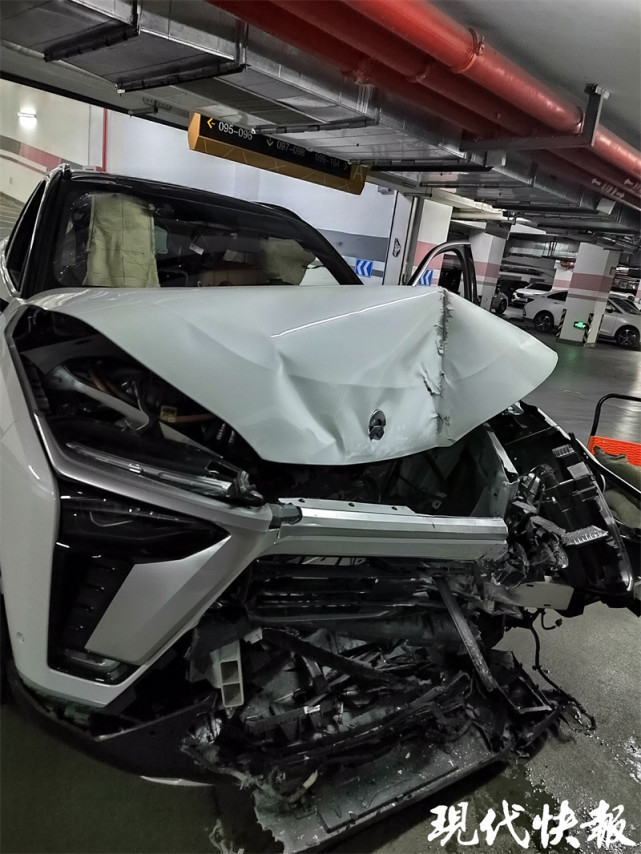 在黄女士提供的现场视频中记者看到, 这辆发生事故的蔚来ES8新能源汽车就停在地下车库负二层的进出口坡道旁,车头部损伤严重,可以清晰地看到内部构件。因为遭到撞击,车辆的前保险杠断裂,引擎盖完全翘起无法闭合,左侧前照灯几乎被剥离车体,耸拉在车头一侧。而遭到撞击的地库石柱上则有着明显的撞击痕迹,柱子上部分水泥已经脱落,一块用于警示的荧光防撞条也因撞击掉了一半,地上散落着石灰块等碎屑。