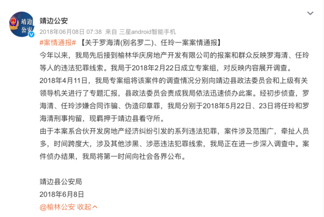 2018年,一则名为“百人举报靖边黑社会”的视频在网上广为流传,该视频发布者实名举报罗海清涉黑,且罗海清还曾上过当地公安的通报: