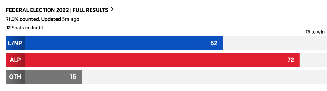 截至政知君发稿,澳大利亚广播公司(ABC)的数据显示,在统计了超过70%的选票之后,阿尔巴内塞领导的工党距离独立执政所需的多数席位还差4席,尚有12席没有公布。