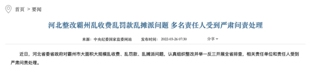 当时,中国政府网发布了《关于河北省霸州市出现大面积大规模乱收费乱罚款乱摊派问题的督查情况通报》。