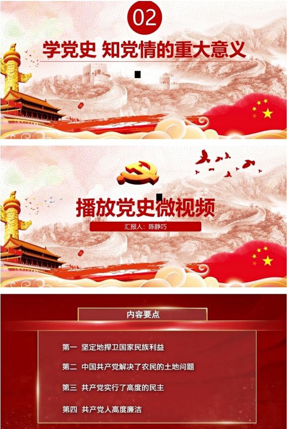 本次党课首先对即将召开的党的二十大进行简单介绍,从而引申出在向第二个百年奋斗目标迈进的新征程时学习党史党情的历史意义以及现实意义,然后通过观看党史系列微视频直观、系统的进行学习。党课微视频取自于中国共产党新闻网国史讲堂的“党史微课”专栏,微课邀请专家学者结合史实资料呈现出党史、新中国史、改革开放史以及社会主义发展史的面貌,根据疫情防控要求,支部全体党员通过腾讯会议的线上方式进行学习、交流,纷纷表示将充分发挥党员的先锋模范作用,自我革命、自我约束,做合格党员,以优异的成绩来迎接党的二十大胜利召开!