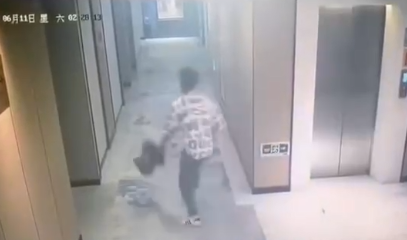 网传视频显示,6月11日凌晨2点27分左右,一名身着黑色裙子的女子从走出电梯,准备回房间。28分许,一名花色衣服的男子出现在镜头中,他突然开始加速跑,冲到一房间门口用力冲撞房门。仅仅过了几秒后,男子就从房间逃出来,乘坐电梯逃离。