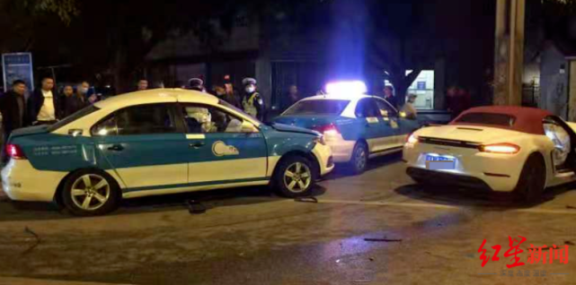 凌晨1时43分许,“砰”的一声巨响,悲剧瞬间发生。一辆车牌号为川A42××7的保时捷跑车闯红灯后,撞上了蒋学品驾驶的出租车,接着又撞上黄某驾驶的另一辆出租车。