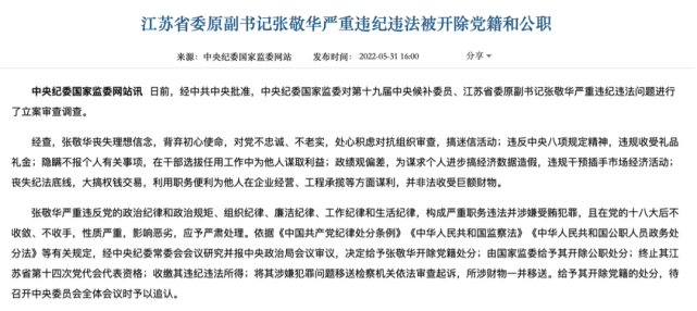 今年5月,张敬华被“双开”,当时的通报中提到: