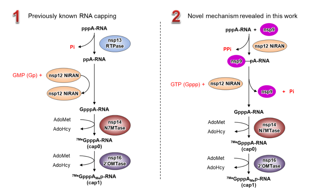 新冠病毒RNA加帽传统机制(左)和本次发现的新机制(右)