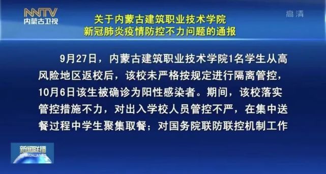 通报中提到,9月27日,内蒙古建筑职业技术学院1名学生从高风险地区返校后,该校未严格按规定进行隔离管控,10月6日该生被确诊为阳性感染者。期间,该校落实管控措施不力,对出入学校人员管控不严,在集中送餐过程中学生聚集取餐;对国务院联防联控机制工作组、自治区有关督导组多次检查指出的问题未立行立改,导致校内疫情扩散。截至10月10日,该校已陆续有39人被确诊为阳性感染者。