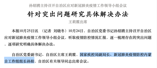 10月24日,内蒙古自治区党委书记孙绍骋主持召开自治区应对新冠肺炎疫情工作领导小组会议。报道显示,新冠肺炎疫情防控内蒙古工作组组长已经变更为国家疾控局副局长孙阳。