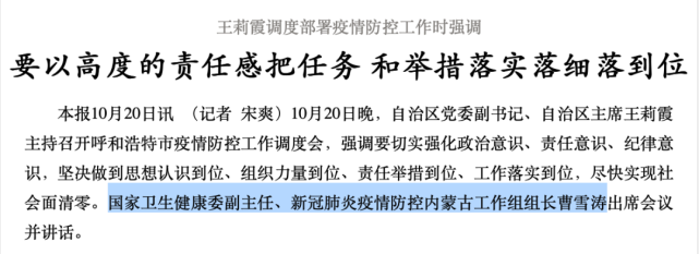 10月20日晚,内蒙古自治区党委副书记、自治区主席王莉霞主持召开呼和浩特市疫情防控工作调度会。当时,曹雪涛以“新冠肺炎疫情防控内蒙古工作组组长”的身份出席。