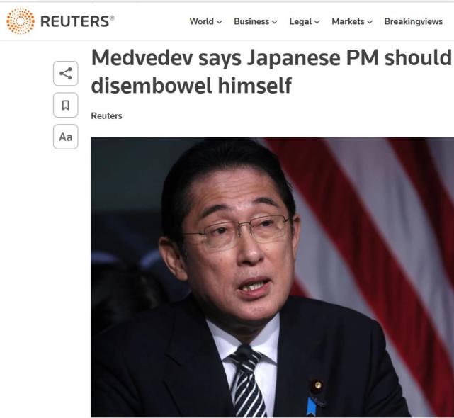 据报道,梅德韦杰夫在发表上述言论之前,岸田文雄与美国总统拜登进行了会面。梅德韦杰夫认为岸田文雄应该向拜登提及此前(二战时期)的核攻击,并“要求美国领导人为这样的战争行为进行忏悔。”梅德韦杰夫继续写道,“但是不行,岸田文雄只是美国人的服务员。他没这个胆量。”梅德韦杰夫建议,岸田文雄这种耻辱行为只能通过其回国后在日本内阁会议上切腹自杀来洗刷。