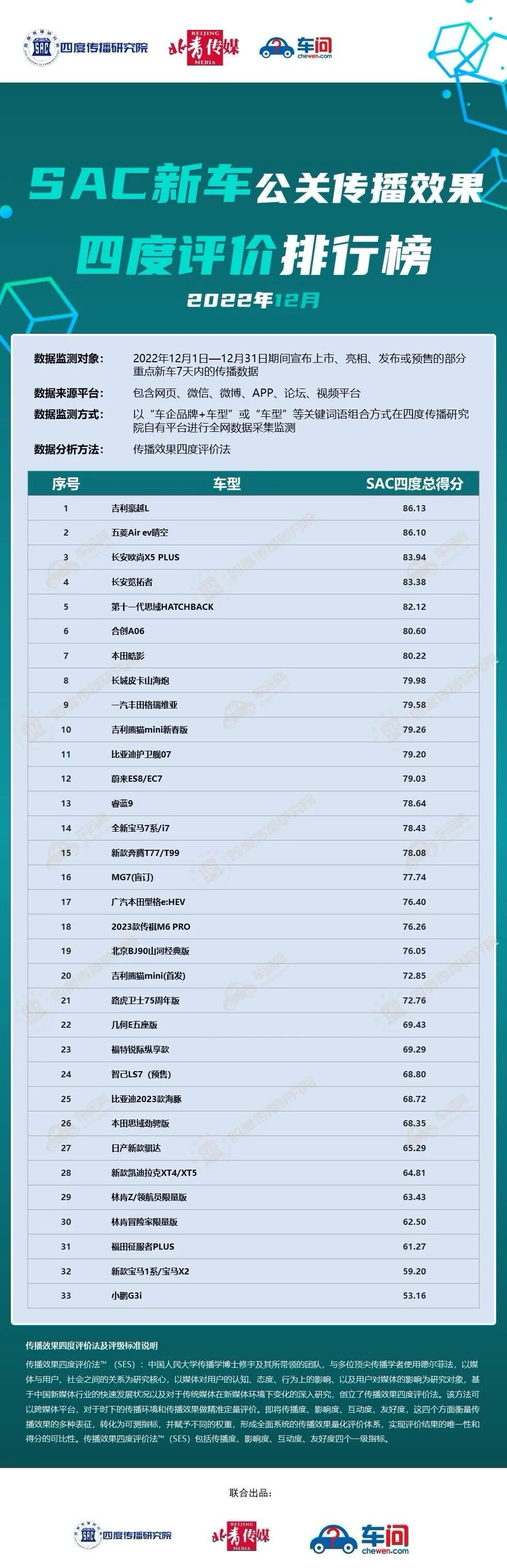 近日,四度传播研究院(SAC™)联合北青传媒、车问网,正式发布了2022年12月份共33款新车的公关传播效果四度评价排行榜。该榜单从传播声量、参与传播的媒体影响、受众互动、媒体和受众情绪倾向等多个维度对新车在7天之内的传播数据进行分析,并根据传播效果四度评价法对传播效果进行量化。