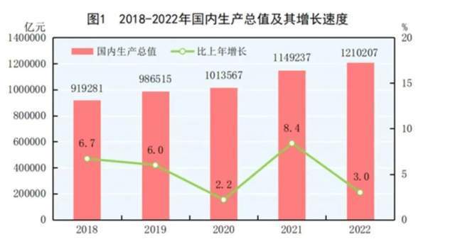 公报显示,初步核算,2022年我国国内生产总值(GDP)为1210207亿元,比上年增长3.0%。