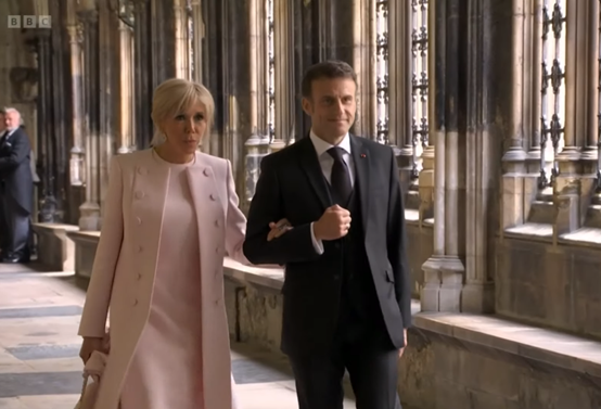 马克龙偕其妻子布丽吉特抵达威斯敏斯特教堂 图自英媒直播画面截图
