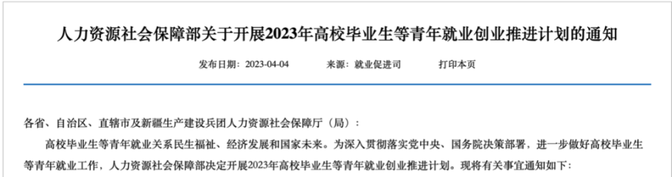 另外,今年4月,国办发布了《关于优化调整稳就业政策措施全力促发展惠民生的通知》,通知提到,“拓宽渠道促进高校毕业生等青年就业创业”。
