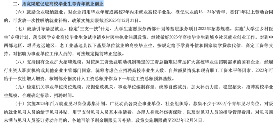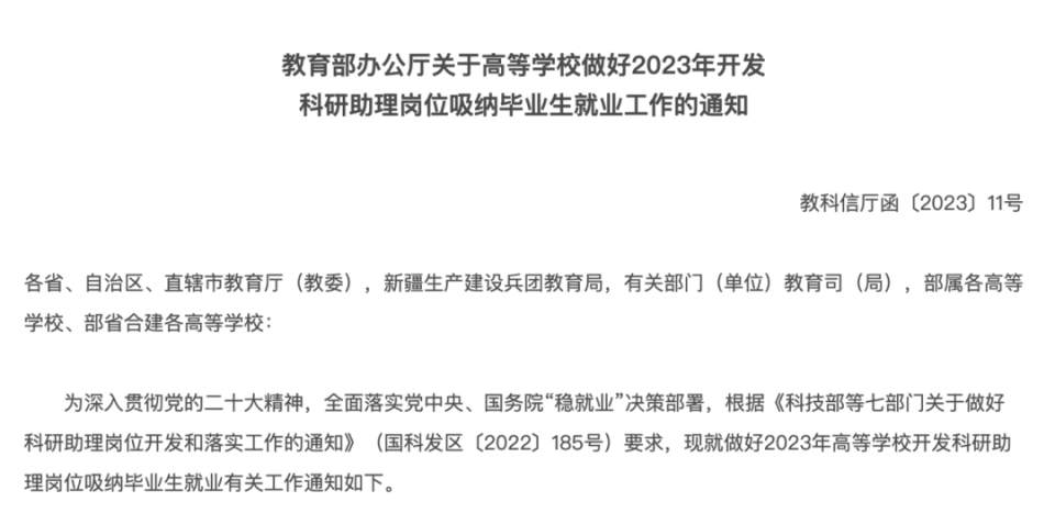 比如,今年4月,人社部印发了《关于开展2023年高校毕业生等青年就业创业推进计划的通知》;5月,教育部印发《关于高等学校做好2023年开发科研助理岗位吸纳毕业生就业工作的通知》。