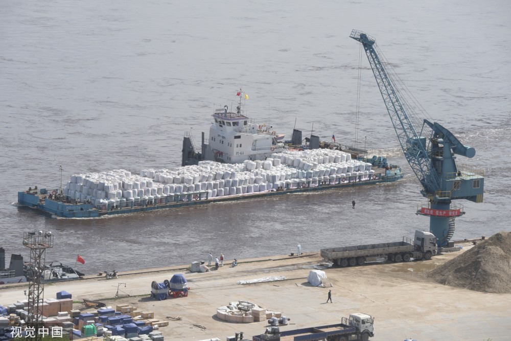 2021年05月28日,黑龙江黑河,载有1000吨大豆的俄罗斯货船抵达黑河口岸码头