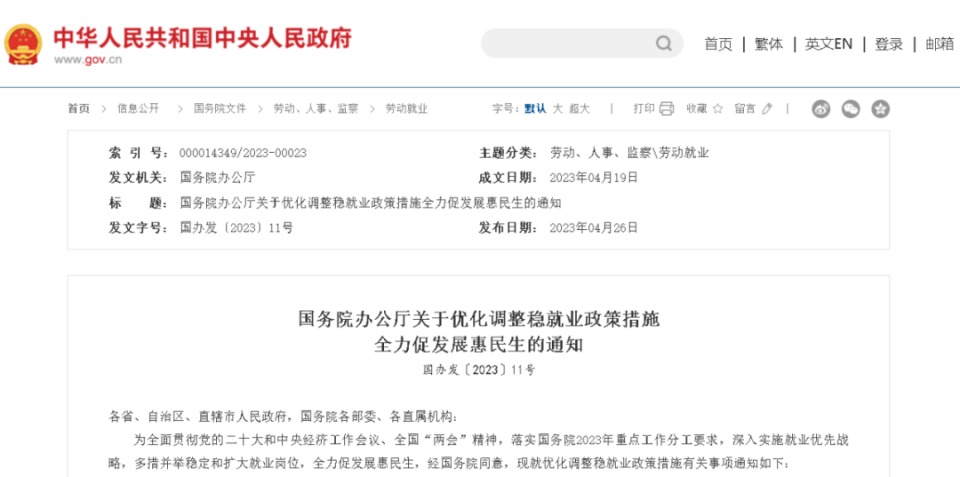 4月26日,国务院办公厅发布《关于优化调整稳就业政策措施全力促发展惠民生的通知》。为深入实施就业优先战略,多措并举稳定和扩大就业岗位,《通知》从“激发活力扩大就业容量”、“拓宽渠道促进高校毕业生等青年就业创业”、”强化帮扶兜牢民生底线”、“加强组织实施”4个方面共推出15条举措,稳定和扩大就业岗位。