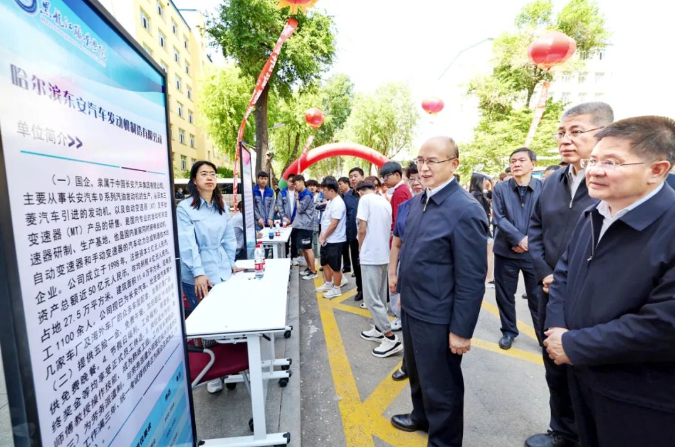 许勤前往社区、黑龙江职业学院、哈尔滨理工大学等地调研。在黑龙江职业学院,许勤还前往正在进行中的校园招聘现场,了解用人企业、招聘岗位、就业意向等情况,并在学院工匠楼与正在开展实训的学生交流。