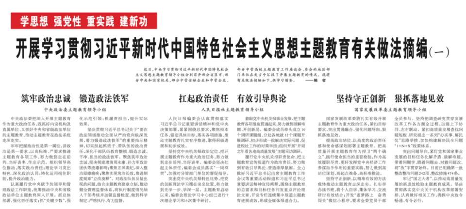 6月6日,《人民日报》刊发了两版《开展学习贯彻习近平新时代中国特色社会主义思想主题教育有关做法摘编》。