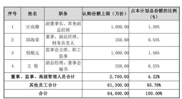 据披露,参加该员工持股计划总人数不超过380人,其中包括四位董监高。员工持股计划初始拟筹集资金总额不超过12.8亿元,其中员工自筹资金不超过6.4亿元,拟通过设立专项金融产品、证券公司融资融券、资管/信托产品等法律法规允许的方式实施,融资资金与自筹资金的比例不超过1:1,即金融机构融资金额不超过6.4亿元。
