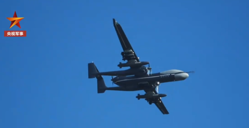 公开资料显示,"双尾蝎"无人机是我国自主研发的一款三发动机重型察打一体无人机。其机长10米,翼展20米,最大航程6000公里,滞空时间约40小时,最大载荷1.2吨,可挂载导弹、精确制导炸弹、电子战吊舱等多种弹药和载荷。