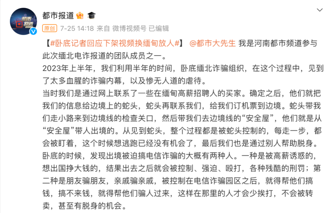 政知君注意到,就在7月25日,河南电视台《都市报道》微博发布了卧底进行缅北电诈报道的记者自述。