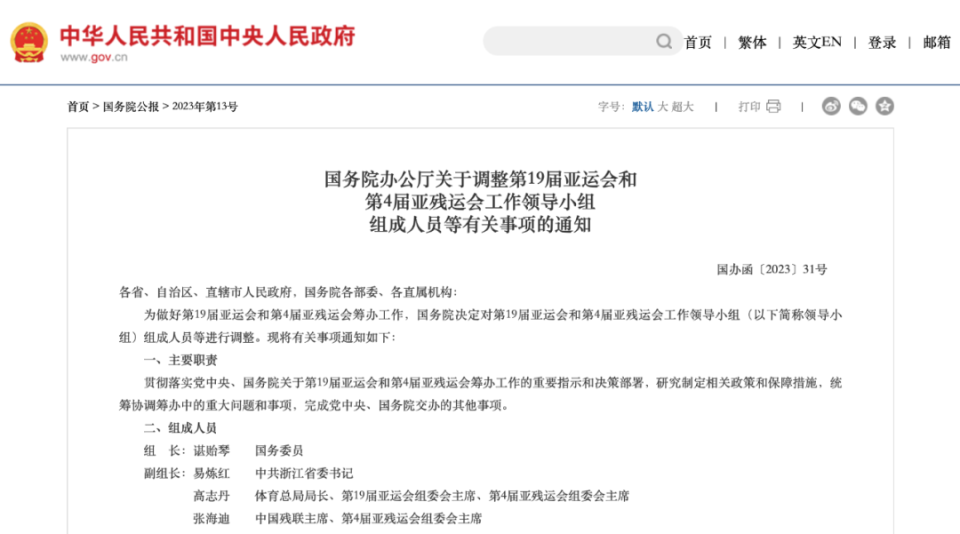 今年4月,国务院办公厅发文称,为做好第19届亚运会和第4届亚残运会筹办工作,国务院决定对第19届亚运会和第4届亚残运会工作领导小组组成人员等进行调整。
