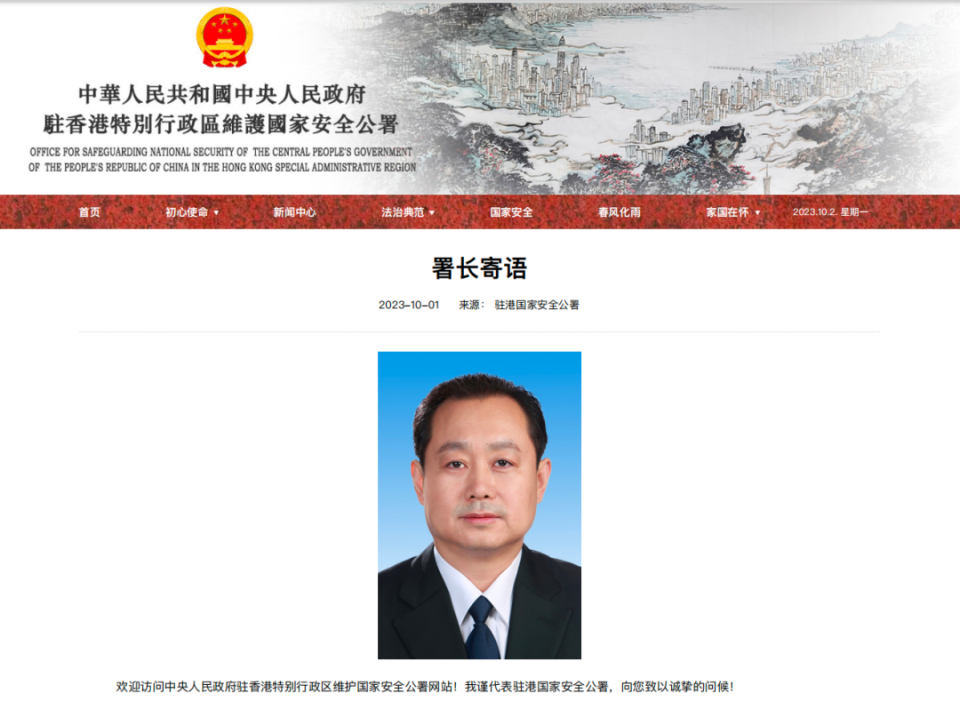 中央人民政府驻香港特别行政区维护国家安全公署官网显示,新任署长董经纬在10月1日发表署长寄语。