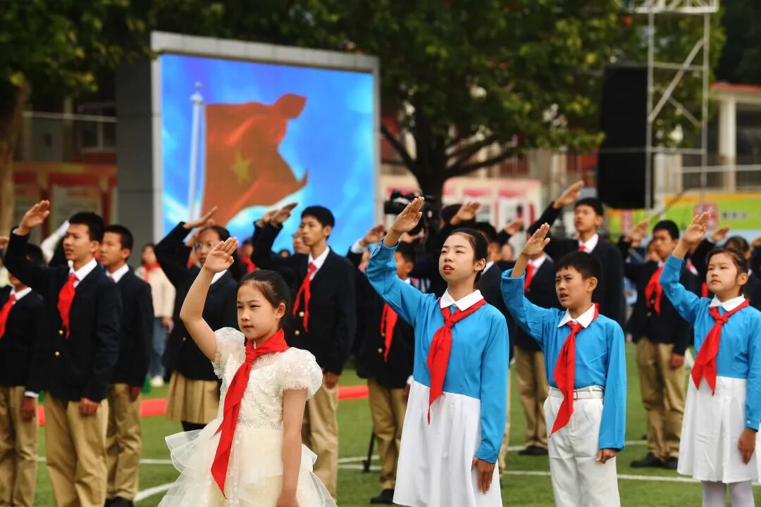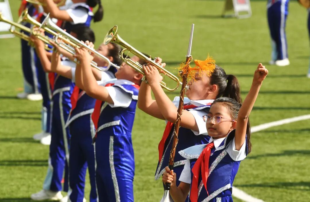 《红星歌》《歌唱祖国》《少年中国说》《歌声与微笑》《让快乐飞翔》《走向复兴》......在一首首熟悉的旋律中,21支少先队鼓号队依次进行展演。