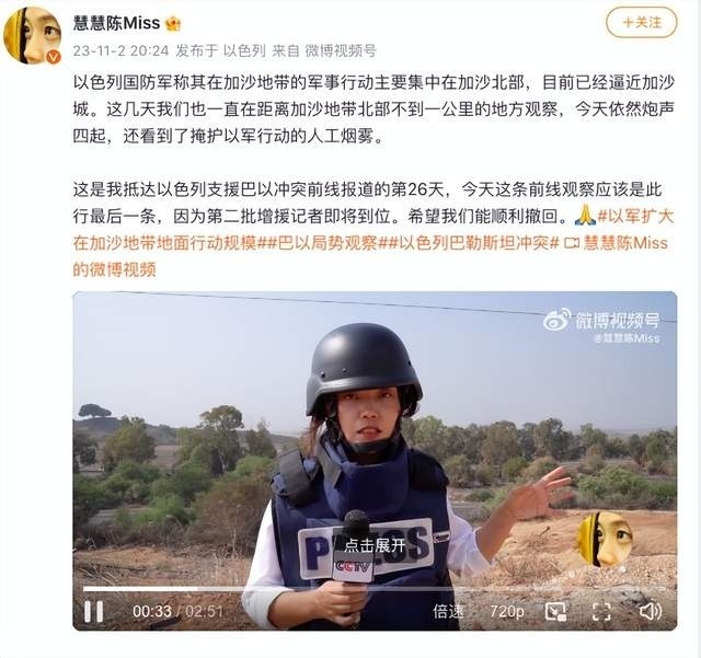 据陈慧慧在社交媒体透露,第二批增援记者即将到位,希望自己能顺利撤回。陈慧慧发文称:这几天一直在距离加沙北部不到一公里的小山坡上报道,炮击声枪击声不断,战机在头上轰鸣。