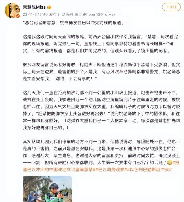 “总台记者陈慧慧、姚书博发自巴以冲突前线的报道。”
