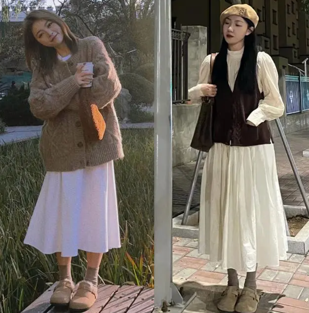 还有几点也需要注意,A字长裙的裙摆宽度尽可能的不要超过肩宽,这样会显得更加精致一些,同时颜色的选择上要避免色块过多,一般建议不超过3种。秋冬季的勃肯鞋搭配,打底袜的颜色选择也很关键,基本可以遵循浅色和白色长裙不要搭配深色打底袜,深色和黑色长裙不要搭配浅色打底袜的简单原则来进行挑选。