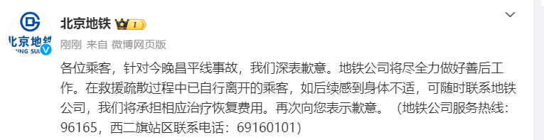 北京地铁12月14日发布微博,就昌平线事故道歉。原文如下:各位乘客,针对今晚昌平线事故,我们深表歉意。地铁公司将尽全力做好善后工作。在救援疏散过程中已自行离开的乘客,如后续感到身体不适,可随时联系地铁公司,我们将承担相应治疗恢复费用。再次向您表示歉意。(地铁公司服务热线:96165,西二旗站区联系电话:69160101)