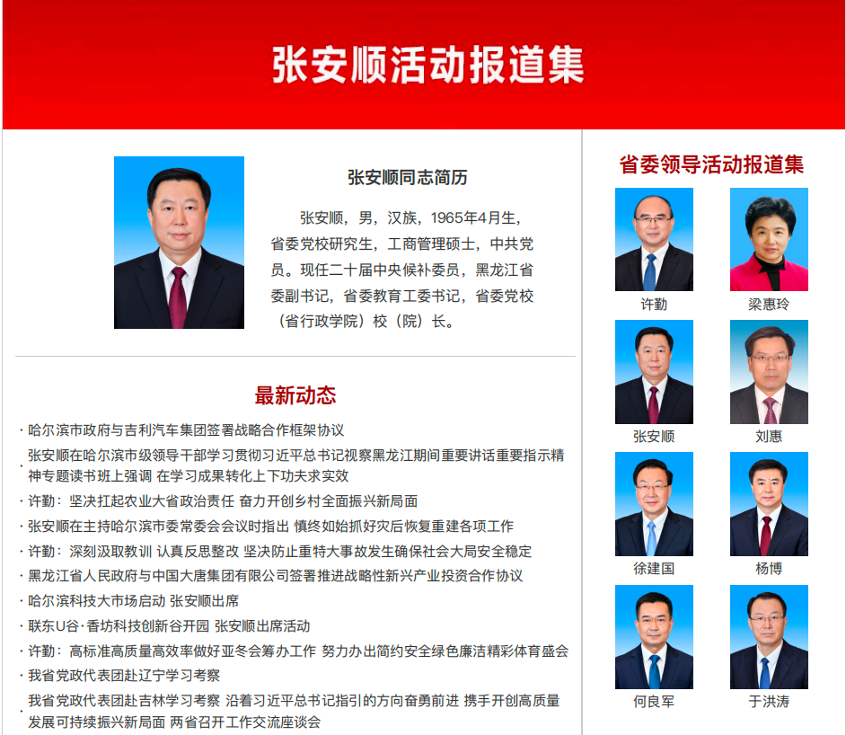 东北网“省委领导活动报道集”栏目近日更新显示,张安顺已任黑龙江省委副书记,省委教育工委书记,省委党校(省行政学院)校(院)长。