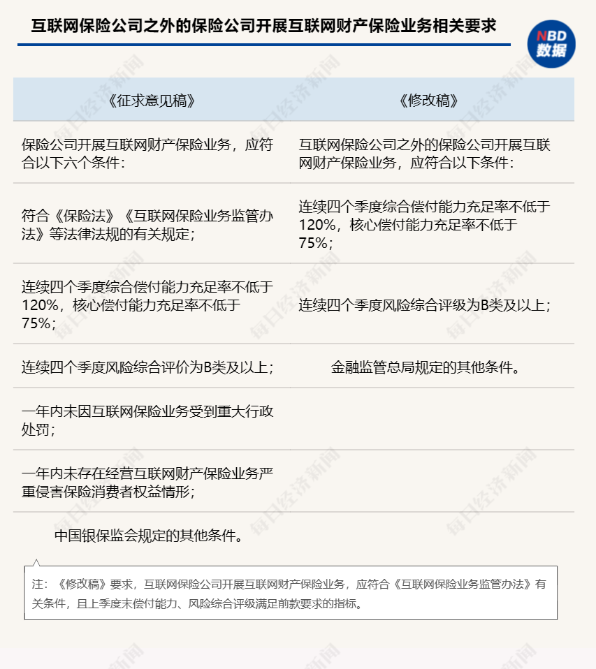 《修改稿》要求,互联网保险公司开展互联网财产保险业务,应符合《互联网保险业务监管办法》有关条件,且上季度末偿付能力、风险综合评级满足前款要求的指标。