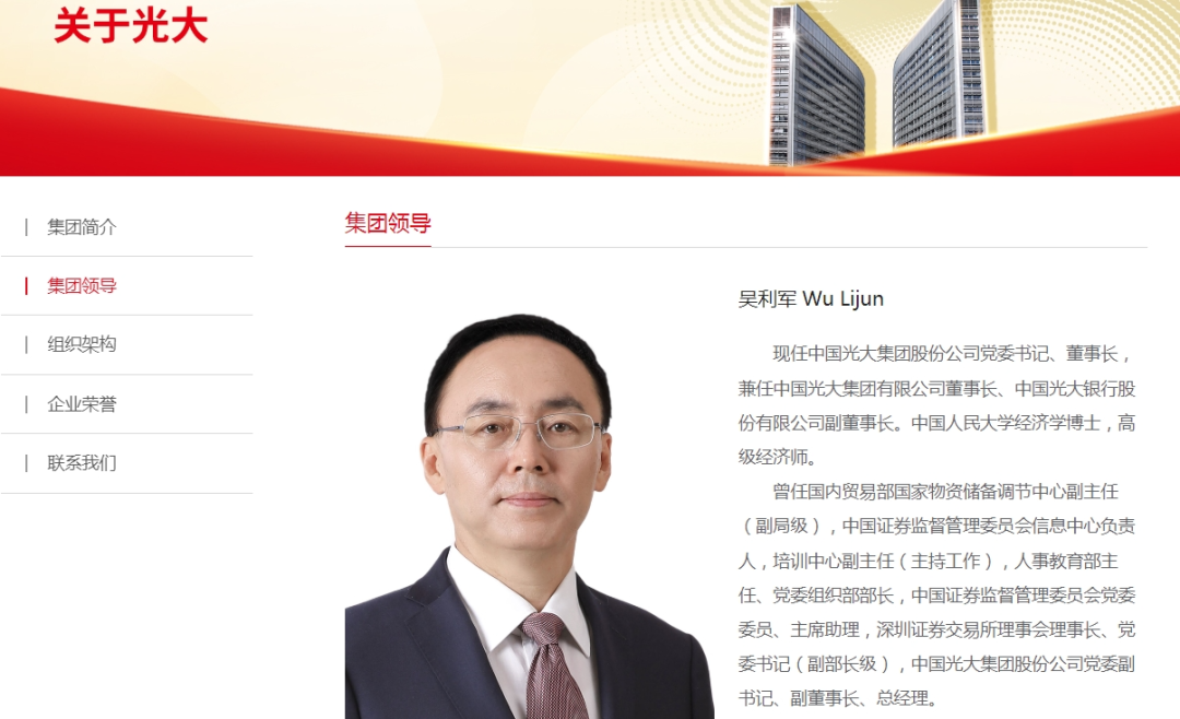 根据光大集团官网“集团领导”一栏介绍,目前光大集团现任党委书记、董事长为吴利军,刘慧敏、洪波、于法昌、王毅均为集团党委委员、副总经理。