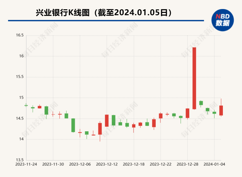 当日,上交所发布关于兴业银行股票2023年12月29日收盘集合竞价异常交易情况的通报,经初步核查,为某投资者以明显偏离股票最新成交价的价格大笔申报成交所致。上交所将对相关情况作进一步深入核查,并根据核查结果采取相应措施。