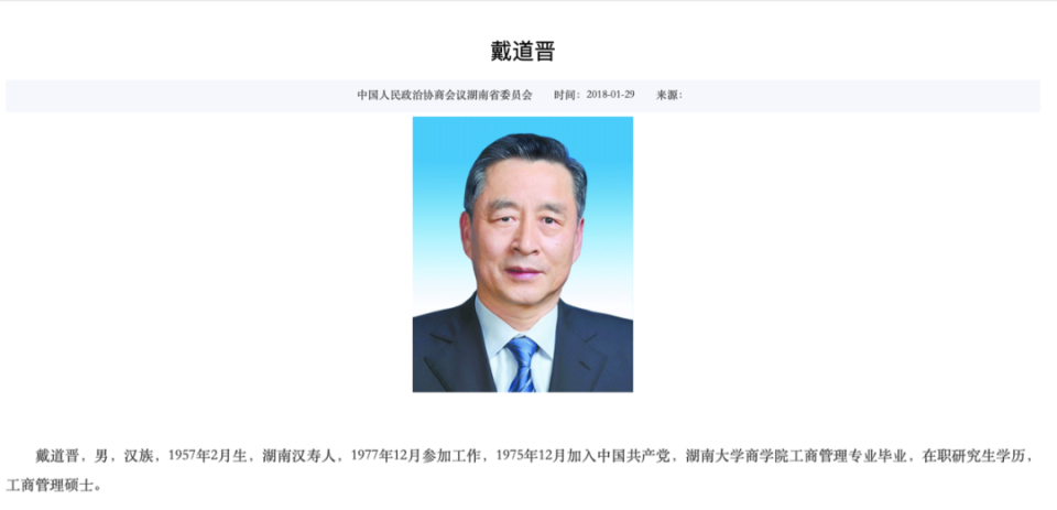 1月26日,中央纪委国家监委官网发布消息,湖南省政协原党组副书记、副主席戴道晋涉嫌严重违纪违法,目前正接受中央纪委国家监委纪律审查和监察调查。