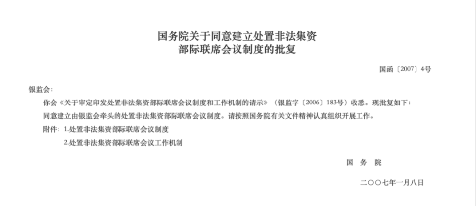 早在2007年1月,国务院就发布了《关于同意建立处置非法集资部际联席会议制度的批复》,同意建立由原银监会牵头的处置非法集资部际联席会议制度,召集人是时任银监会主席刘明康。