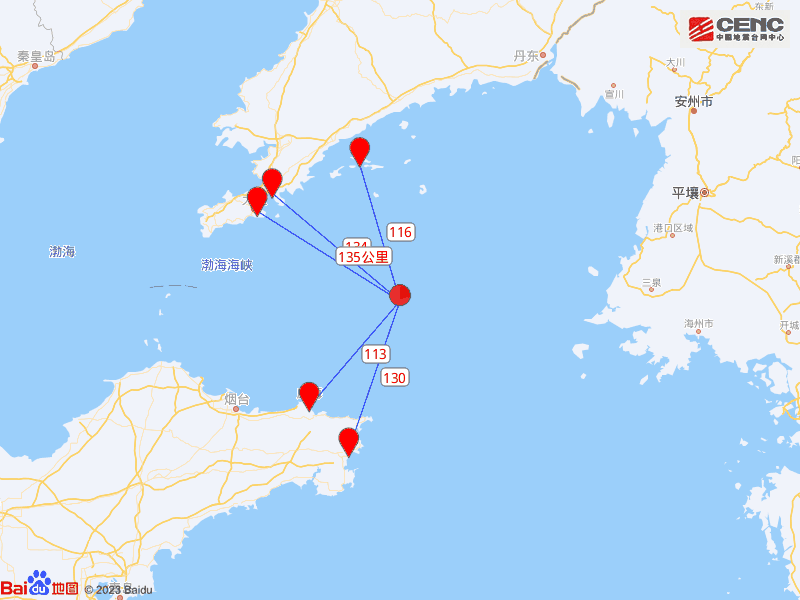 震中距山东威海环翠区113公里、距辽宁长海县116公里、距山东荣成市130公里、距辽宁大连金州区134公里、距辽宁大连中山区135公里,距山东威海市112公里,距0公里,距0公里,距沈阳市399公里。