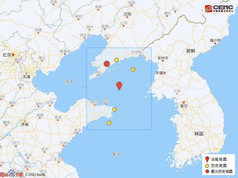 根据中国地震台网速报目录,震中周边200公里内近5年来发生4级以上地震共2次,最大地震是2023年8月23日在辽宁大连市普兰店区发生的4.6级地震(距离本次震中144公里),历史地震分布如图。